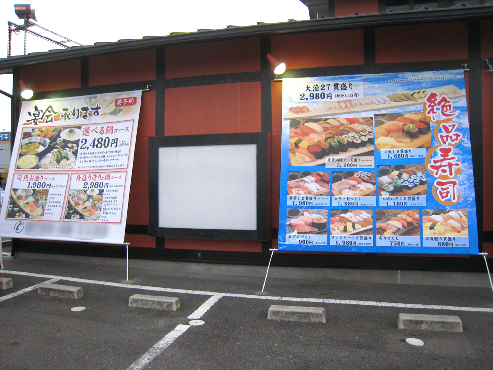 大型のタペストリーを複数設置することで、お店に迫力が出ます。売りの商品の訴求。