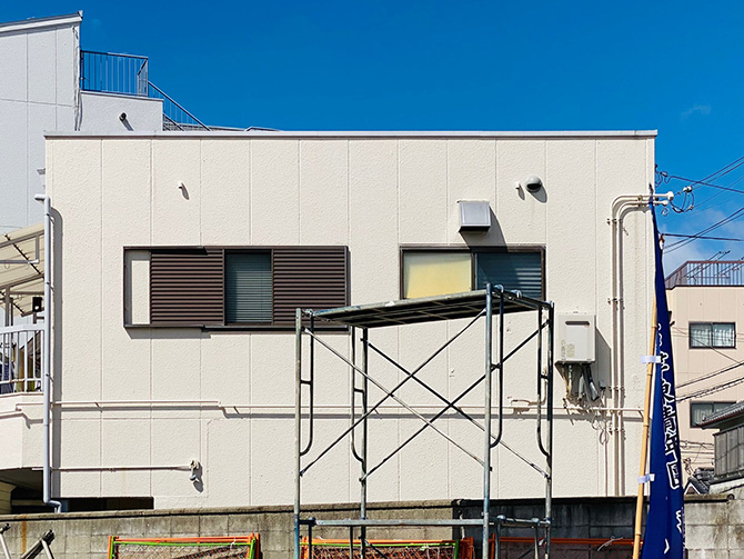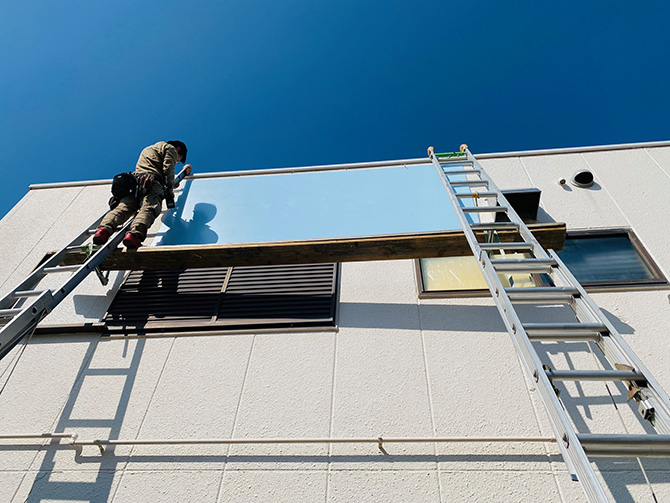 そこで、建物が3階建てであることを活かして、壁面に貼れる限りの大きさの看板を設置いたしました。