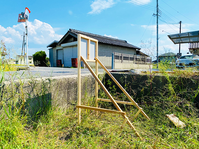 木枠で骨組みを作り、板面を貼り付けたシンプルな短期間限定の看板です。