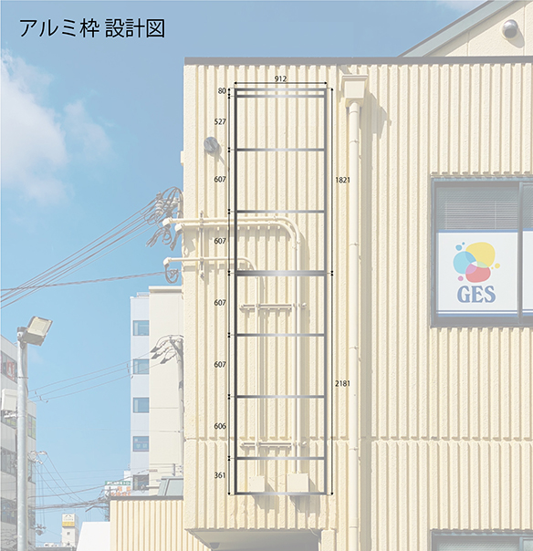 設置場所の壁面の障害物などを正確に採寸し、設計図を用いてアルミ枠の形状を決定しました。