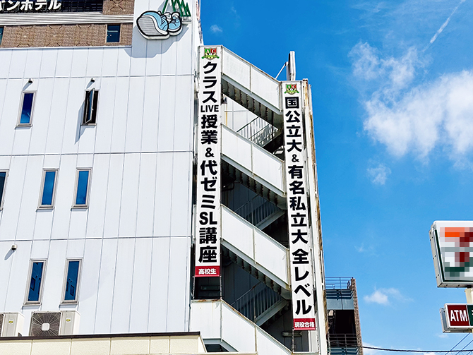 「国公立大&有名私立大」「LIVE授業」といったターゲットが求める核心情報を力強く配置し、抜群の視認性と情報伝達力で一瞬で惹きつけます。